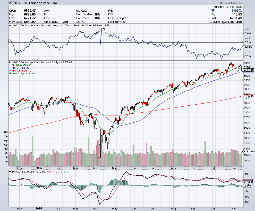 The S&P 500 declined 1.66% to 6,737.49, pulling back sharply into a major support cluster. Despite the drop, the broader uptrend remains intact as long as 6,700 holds.